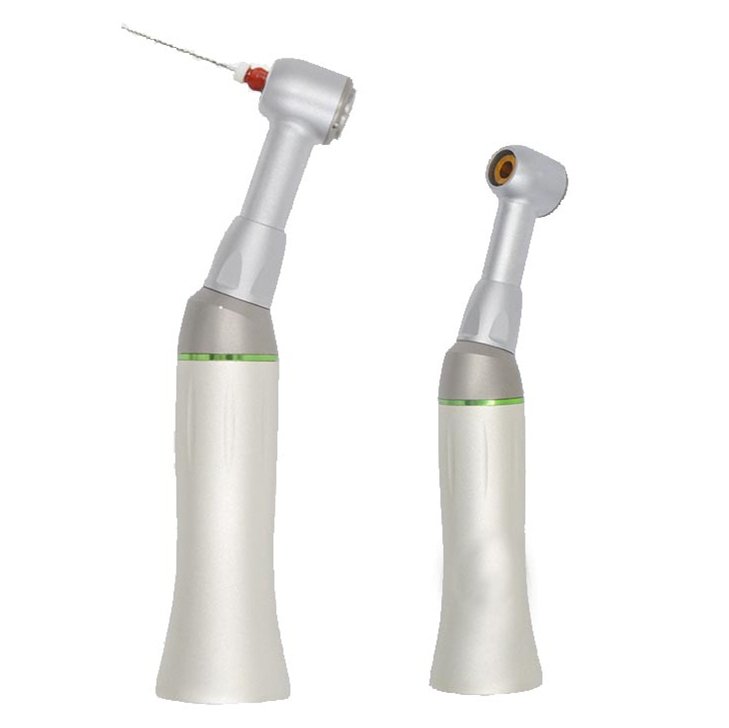 The endodontic handpiece is a contra-angle design with a speed reduction ratio of 10:1. It fits all E-Type motors and is compatible with all brands of endodontic hand files.